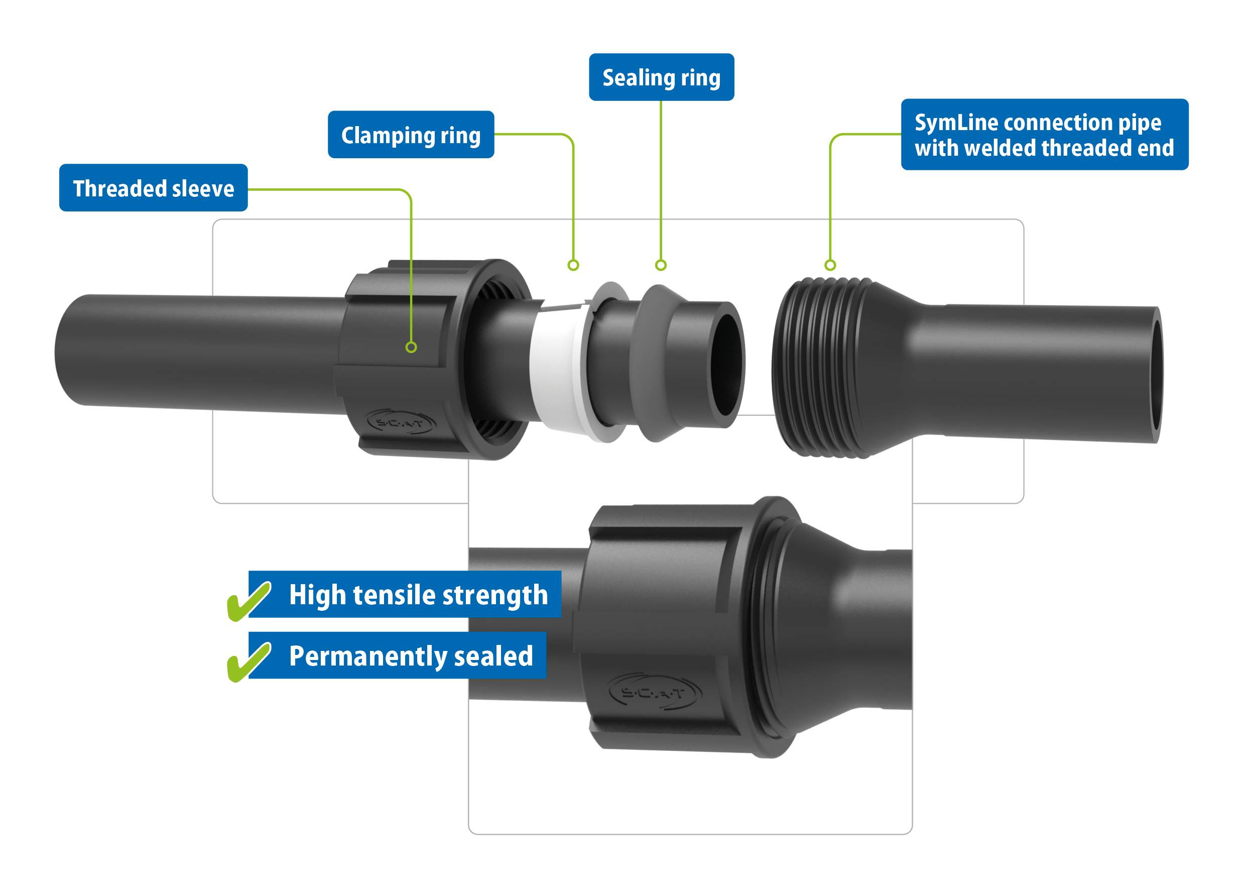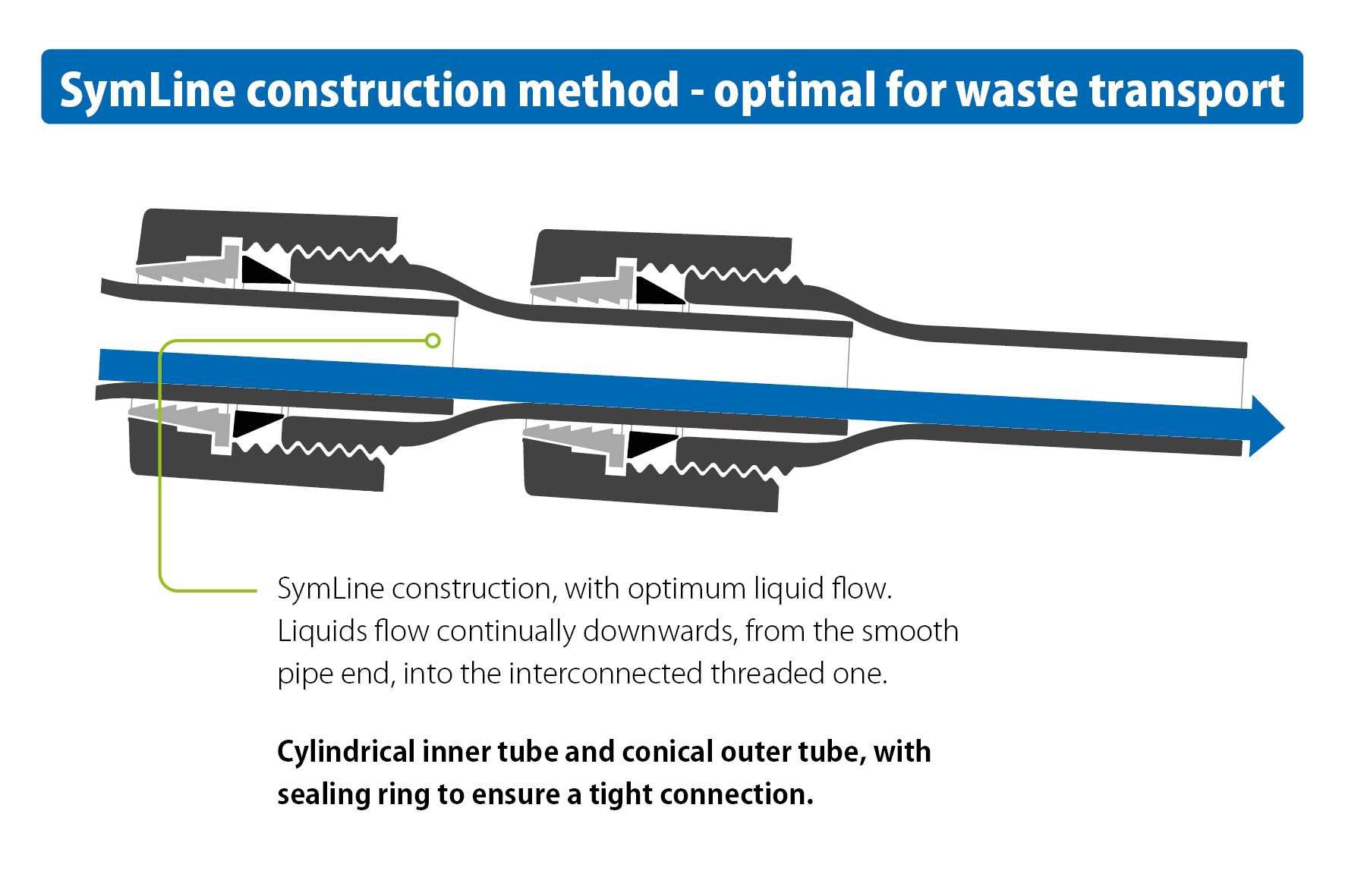 The SymLine connection tubes have a funnel-shaped threaded sleeve at one end and a smooth tube opening at the other. In order to tightly interconnect the tubular system, the threaded sleeve, clamping ring and sealing ring are simply pushed over the smooth end of one tube, and this is then firmly screwed on to the threaded part of the following extension piece ( i.e. on the other tube ). When done properly (tightening torque 5 Nm), the resulting connection will withstand a tensile force of 400 N. The system allows for optimum flow of waste liquids and prevents leakage.