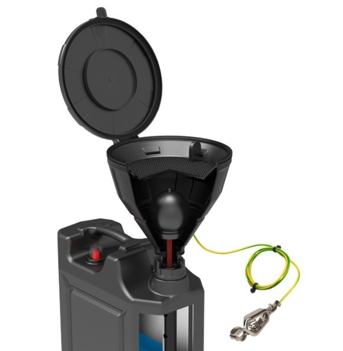 Funnel "ARNOLD" with ball-valve and lid, V2.0, ASTM63, PE-HD electrostatic conductive, with splash guard, removable sieve and grounding cable, funnel diameter = 200 mm