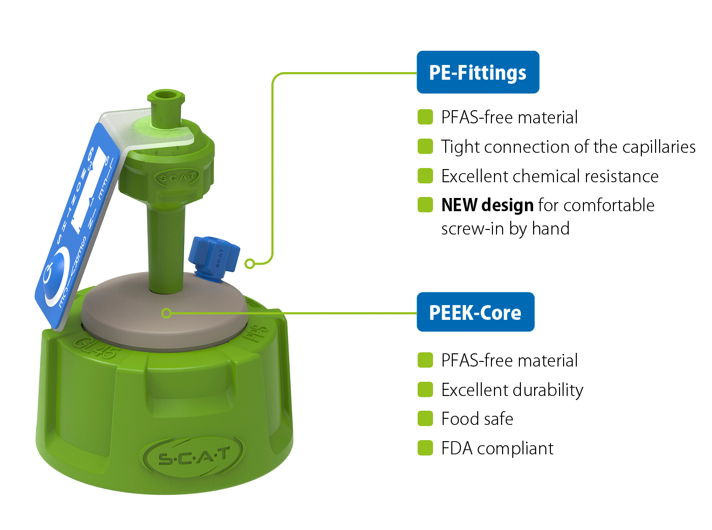 SCAT therefore offers Safety Caps with a core made of polyetheretherketone (PEEK) – a PFA-free material that enables reliable analyses.
